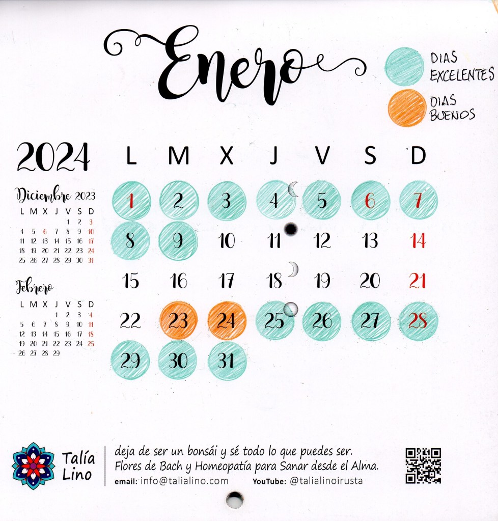 En esta ocasión uso de base un calendario que esta hecho con mucho amor y sabiduría por Talía Lino, profesora de flores de Bach y Homeopatía y también es la autora de preciosos calendarios donde ella hace todo: las fotos, el valioso texto y todo lo demás, incluido los ciclos lunares, el texto de enero dice asi: